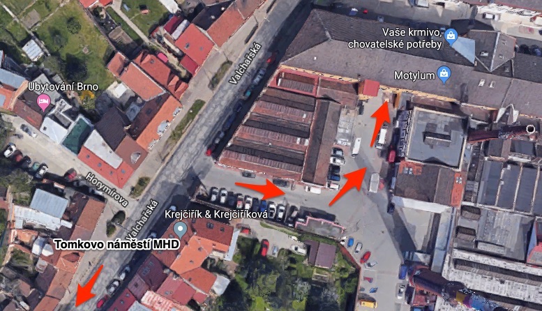 MHDNejbližší zastávka MHD je Tomkovo náměstí, Brno. Jezdí sem autobusy 44, 57 a 84. Šalina č. 4 a trolejbusy 25, 26, 39 a 38. Jděte podél tramvajových kolejí směrem k Maloměřickému mostu. Dobrým orientačním bodem je komín s nápisem Helbich. |